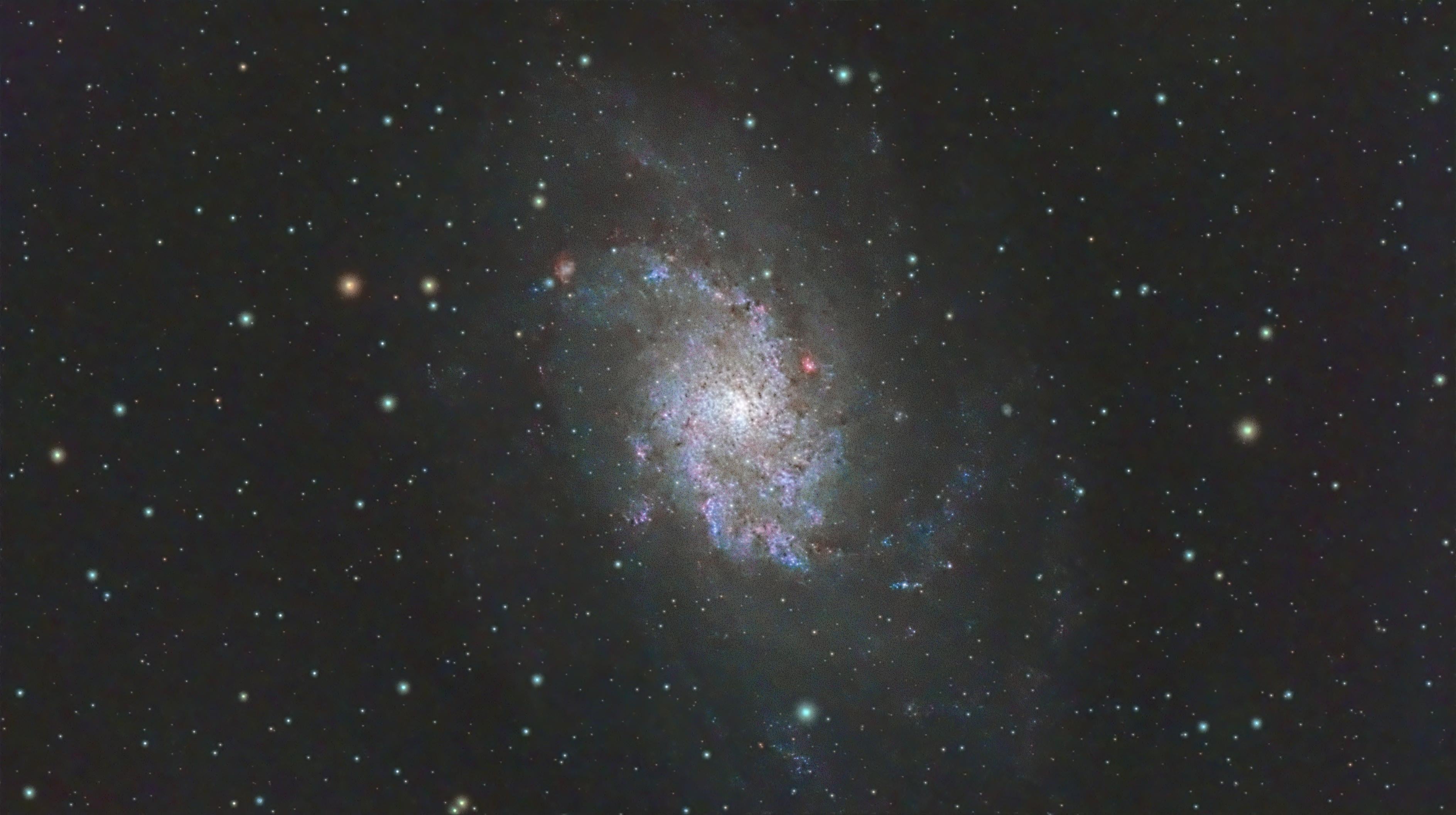 Here is one of my first shoots of M33 or The Triangulum Galaxy. It is noisy I know but I tried to reduce it as much as I could. I think that is due to my gain being at 100 below the HCG of my ASI585MC Air which should have been 200, but what is done is done. Anyways:
