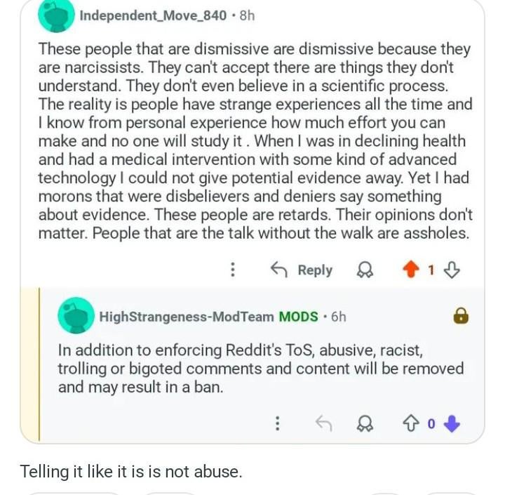 I am literally pointing out behavior that should be considered unacceptable here because experiencers get a lot of abuse and it's being called abuse. A mod thinks it's a good idea to get in on the abuse we already have to put up with..