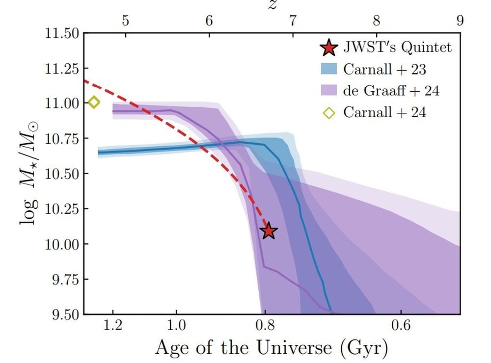 This figure from the study shows how JQ could be a precursor to the unexpected massive quiescent galaxies previously found by the JWST. The red dashed line shows the expected stellar mass growth of the JQ system. The shaded regions show the quiescent galaxies star-formation history, where the two different shades are different confidence intervals. The olive diamond is one of the confirmed massive quiescent galaxies. "The future growth of the JQ system is consistent with these tracks," the authors write. Image Credit: Hu et al. 2026 NatAstr *This figure from the study shows how JQ could be a precursor to the unexpected massive quiescent galaxies previously found by the JWST. The red dashed line shows the expected stellar mass growth of the JQ system. The shaded regions show the quiescent galaxies star-formation history, where the two different shades are different confidence intervals. The olive diamond is one of the confirmed massive quiescent galaxies. “The future growth of the JQ system is consistent with these tracks,” the authors write. Image Credit: Hu et al. 2026 NatAstr*