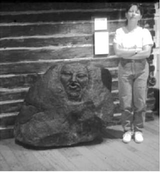 All holes and drainage spouts are plugged with putty or other additions, suggesting no interest in a modern restoration. The mysterious face carving and associated cavities have given rise to speculation about its origins, including one theory that the stone was carved by prehistoric Mediterranean seafarers who used the 3,000-pound  boulder as a mooring stone.