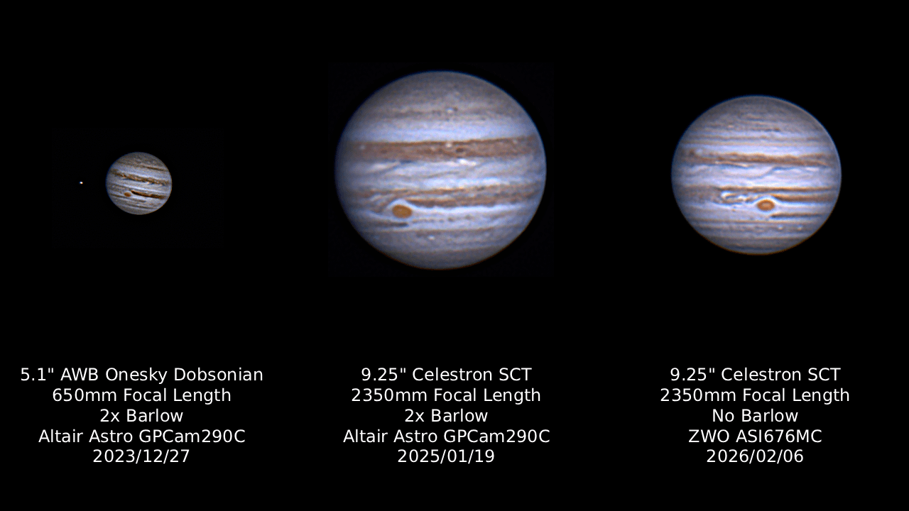 Got a new mount and new planetary cam this year so wanted to compare my best Jupiter shots side by side. I think it showcases an interesting look at what can be achieved on the same target with different equipment. Far left shows my first telescope (AWB Onesky) and my motivation to upgrade to the Celestron 9.25" SCT (middle and right images).