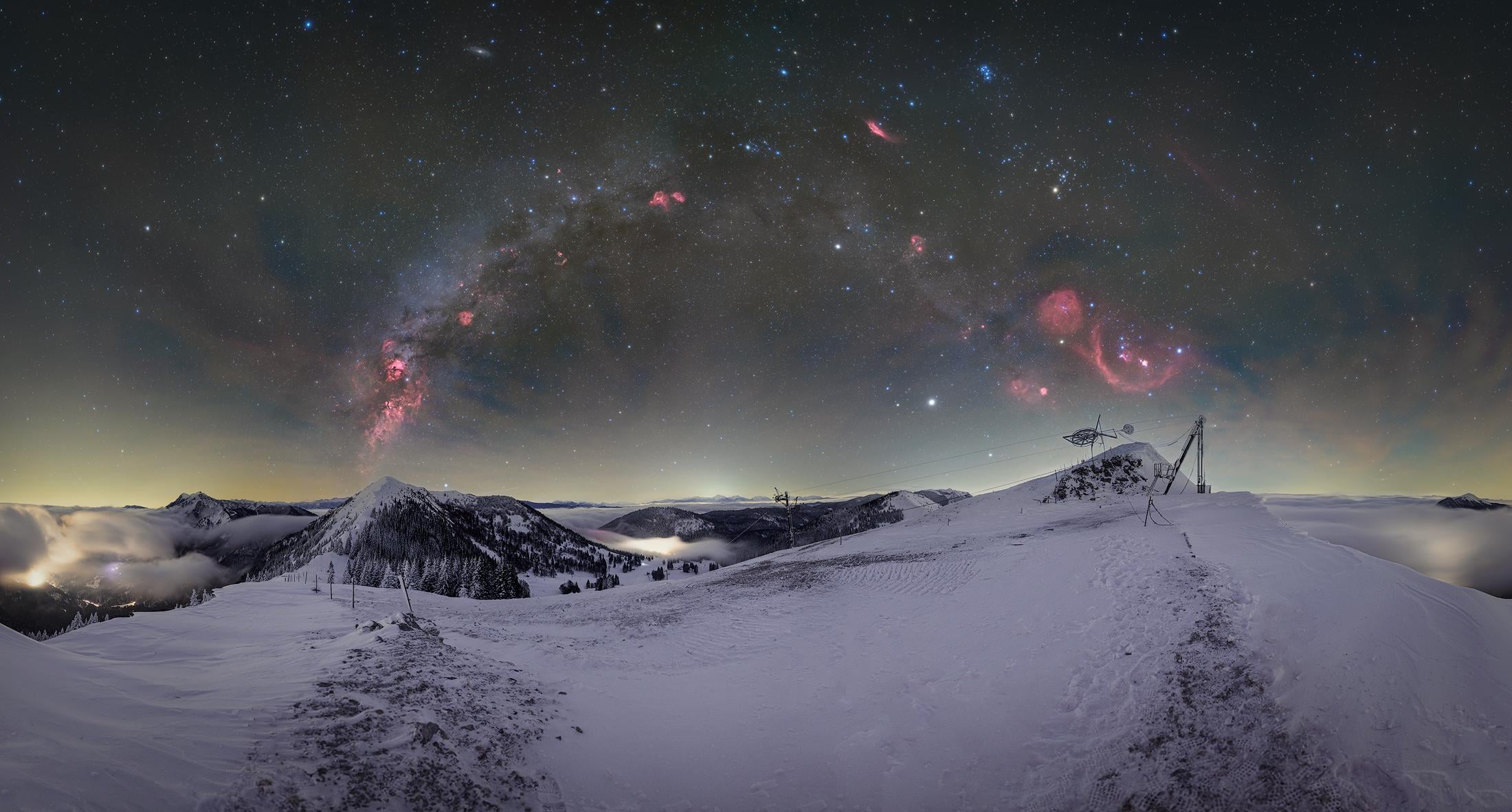 Snow-capped landscape, fog in the valleys below and a star-filled sky above. Nothing more needs to be said.