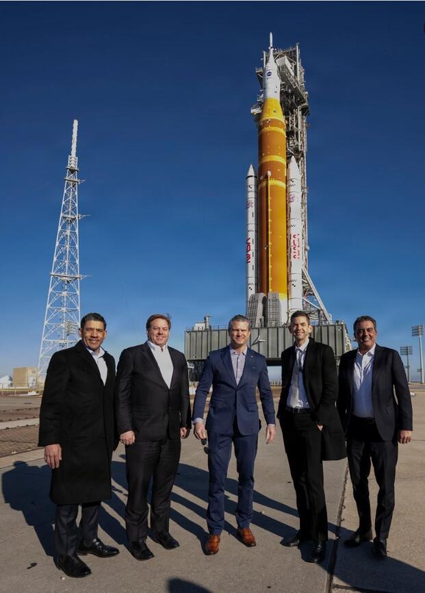 Secretary of War Pete Hegseth tours the rocket pad of Artemis 2 with NASA Administrator Jared Isaacman during his visit at the Kennedy Space Center, as part of his Arsenal of Freedom Tour, Merrit Island, Fla., Feb. 2, 2026. (DoW photo by U.S. Navy Petty Officer 1st Class Alexander Kubitza, DVIDS)
