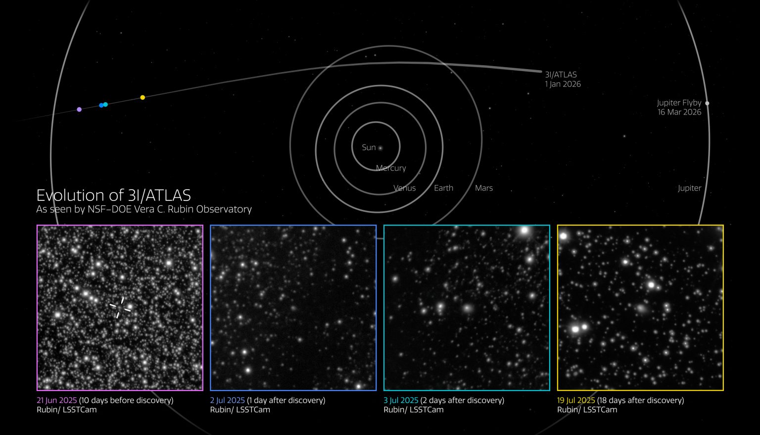 Interstellar comet 3I/ATLAS in images taken by the Vera Rubin Observatory between June 21 and July 19, 2025. Source: NSF–DOE Vera C. Rubin Observatory/NOIRLab/SLAC/AURA