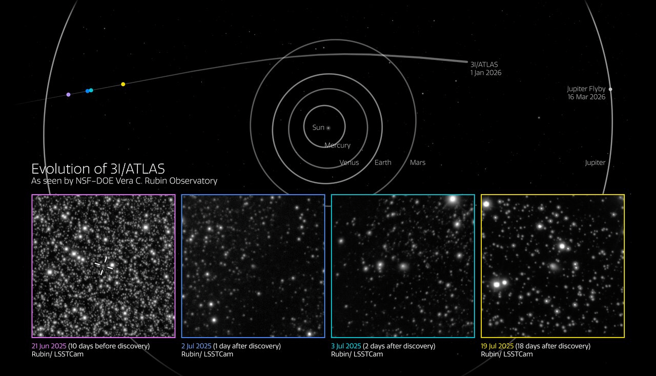 Observations of interstellar comet 3I/ATLAS by the Vera C. Rubin Observatory. Four images are displayed, captured at various times: 10 days before discovery, 1 day after discovery, 2 days after discovery, and 18 days after discovery. On top of these four images is displayed a model of the orbits of the solar system inner planets and that of Jupiter, along with the trajectory of the comet, where the locations corresponding to the four observations are pinpointed.