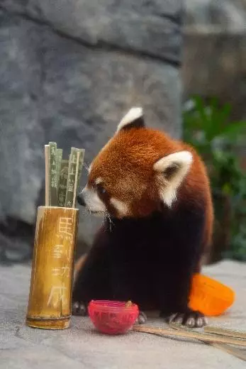 Red panda Cong Cong dives into the festive spirit as well and playfully interacts with a traditional fortune stick container. What fortunes will the adorable red panda draw for the new year? A truly delightful sight!