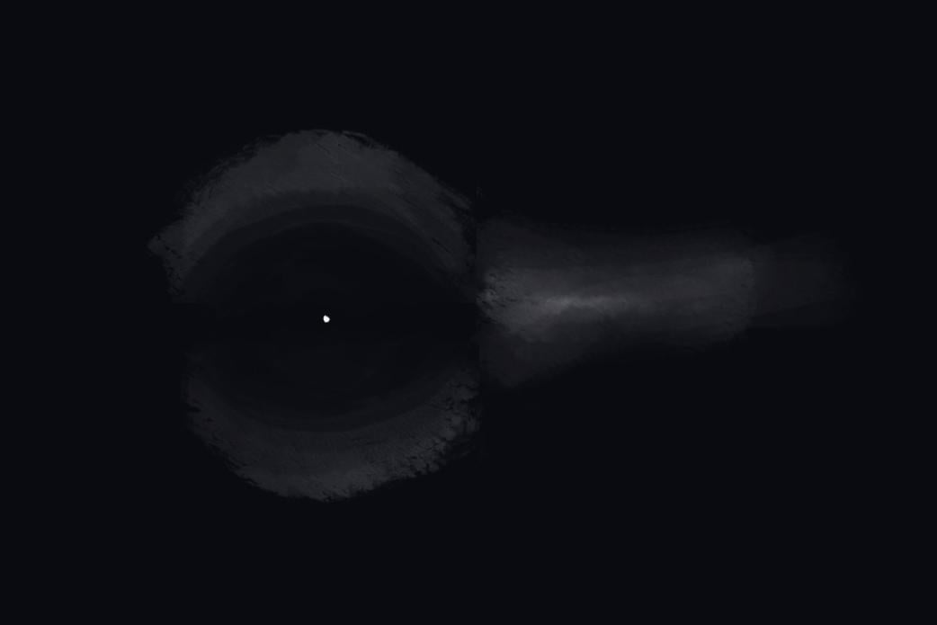 It was around ~3 degrees long, and maybe ~1-2 wide. I saw it first by eye where it looked like a very large plane, but cloudier and moving at about the same speed a plane at a couple thousand ft altitude would move. Once I noticed how odd it looked I checked it out through my binoculars (I was awaiting an ISS passover at the time), and saw that most of the apparent structure looked more like smoke or haze and that the only visible object was a tiny white dot in the center of it. But the entire thing (smoke/haze and dot) was moving at the same speed in tandem, there was no contrail beyond the short trail on the right side of it that stayed the same length the entire time.