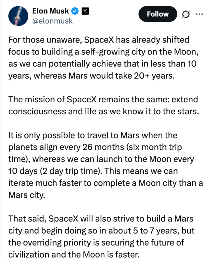 But Musk’s ambtions to colonize Mars aren’t going anywhere, he said. “That said, SpaceX will also strive to build a Mars city and begin doing so in about 5 to 7 years, but the overriding priority is securing the future of civilization and the Moon is faster.”