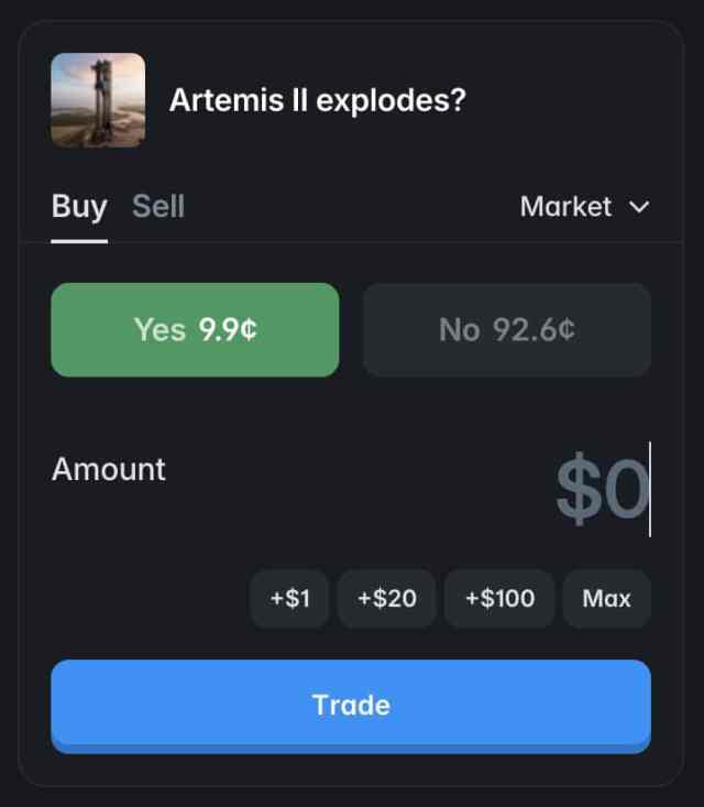 Polymarket offered bets on the outcome of the upcoming NASA Artemis II mission, specifically on whether it would explode. Four astronauts are scheduled to be onboard.