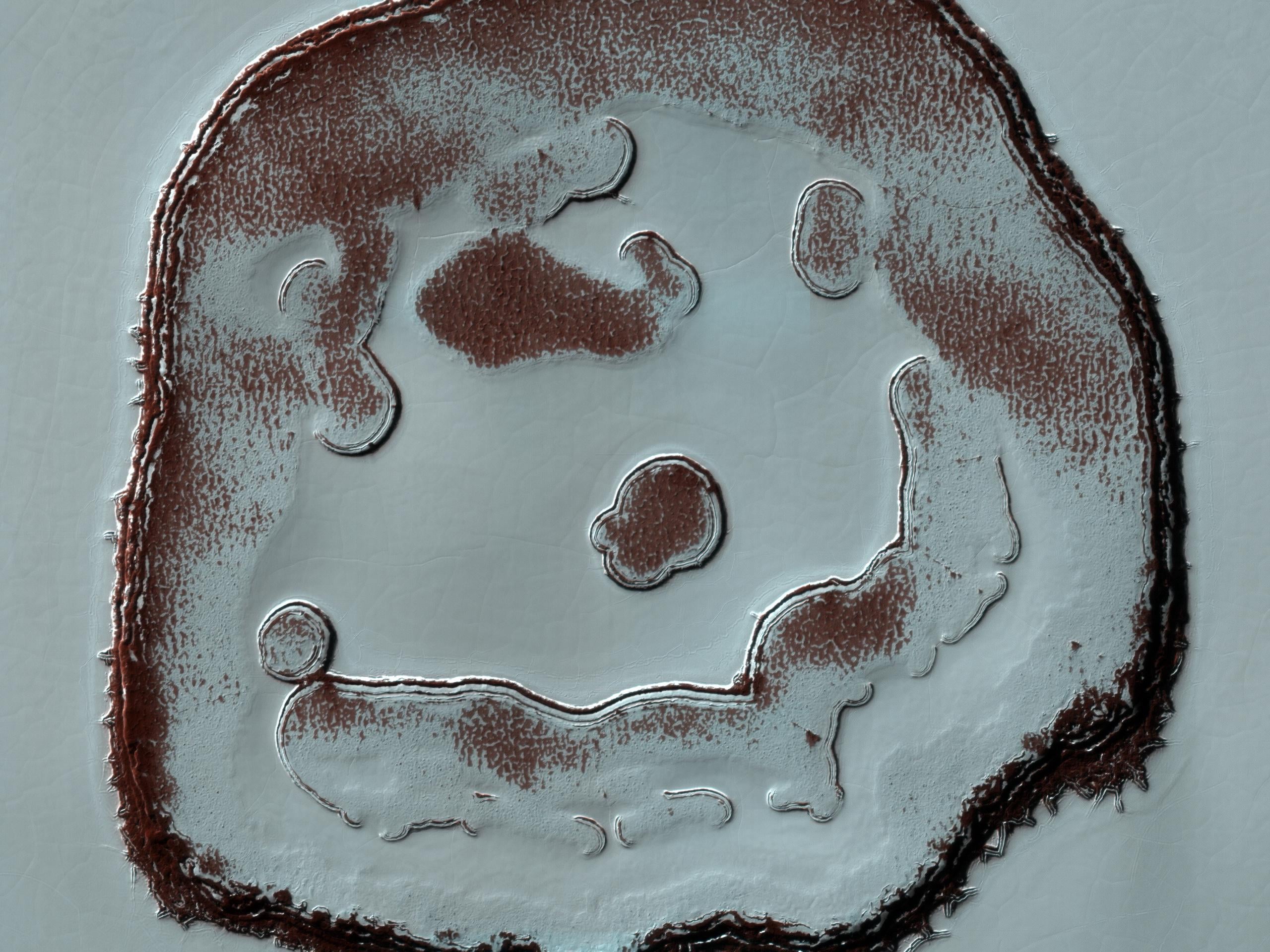The “blobby” features in the polar cap are due to the sun sublimating away the carbon dioxide into these round patterns. You can see how nine years of this thermal erosion have made the “mouth” of the face larger. The “nose” consisted of a two circular depressions in 2011, and in 2020, those two depressions have grown larger and merged.