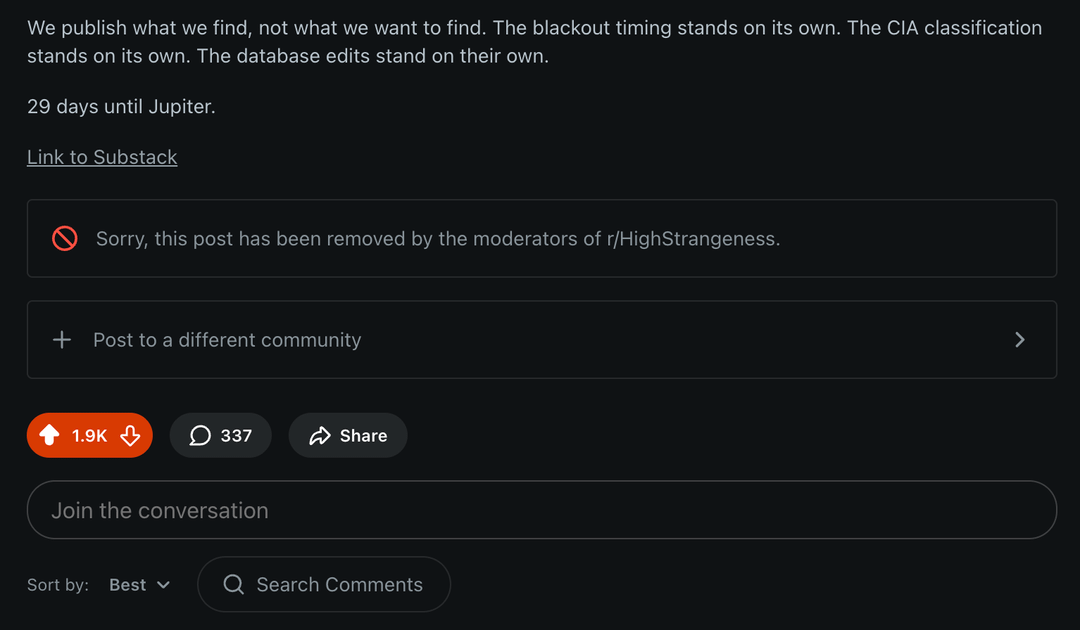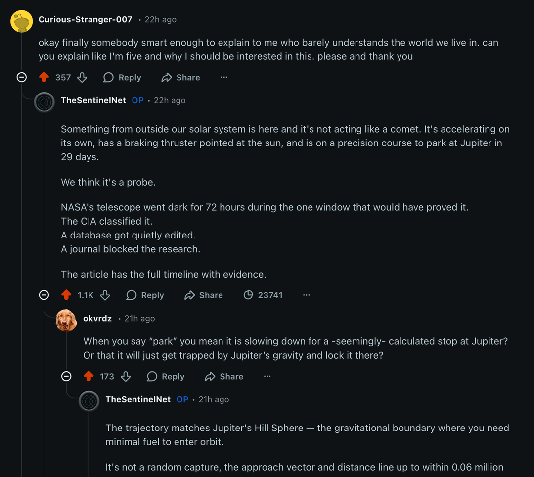 Yesterday I posted about 3I/Atlas. In less than 24 hours it received 1900+ upvotes and hundreds of comments from this community. It was removed with this reason: