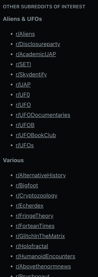 "Content must clearly relate to subjects listed in the sidebar. Posts and comments unrelated to High Strangeness, such as: sociopolitical conspiracies, partisan issues, current events and mundane natural phenomena are not relevant to the sub and may result in moderator action."