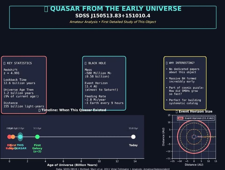 For comparison, I previously analyzed a z=2.003 quasar with a ~217 million M☉ black hole. This z=5 quasar is 2.7× more massive but formed 1.9 billion years earlier in cosmic history!