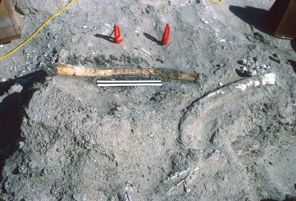 The age of the site, about 500,000 YBP, was estimated by Miller’s team from a Uranium-Thorium date on bone samples of the mammoth (>300,000 YBP) and a magnetic polarity stratigraphy (paleomag) date of 720,000 YBP of a local sedimentary layer, plus supposed associations with a volcanic ash layer (>600,000 YBP) and other nearby fossils known from a particular time period (1.9 million YBP to 500,000 YBP). The team postulated that the marks were made by early human hunters, possibly Homo erectus, using the ribs as “chopping blocks,” with a primitive stone chopper or hand axe. This would place humans or their immediate ancestors at this site in North America nearly 500,000 years ago.