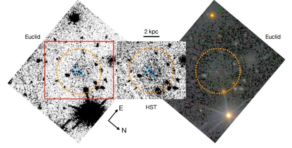 *This figure is made up of cutout images from Euclid’s VIS and the Hubble’s Advanced Camera for Surveys. The central part stacks both images from the Hubble’s ACS and shows extremely diffuse emissions around CDG-2s’s four GCs. Euclid data confirms it. Image Credit: Li et al. 2026. ApJL*