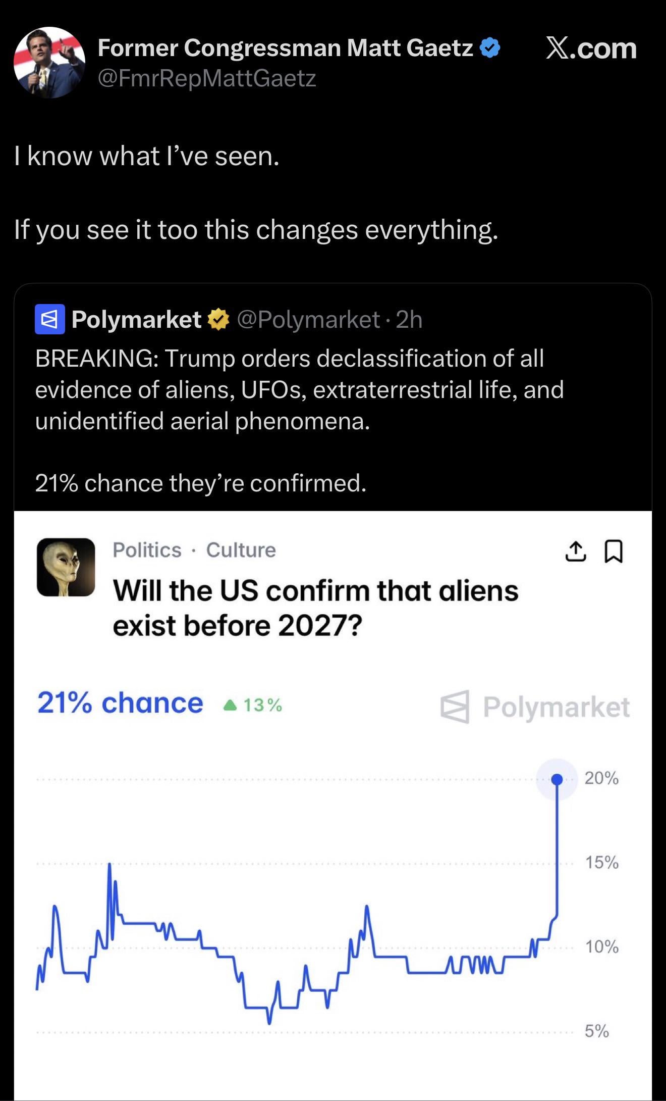11. I think based on Trump’s talk on the plane about it being classified tells me they are not going to release it, ever. They’ve just continuously roped on the public forever and they’re never going to tell us. They might all tease it and they’re almost certainly buying the “NO” on polymarket