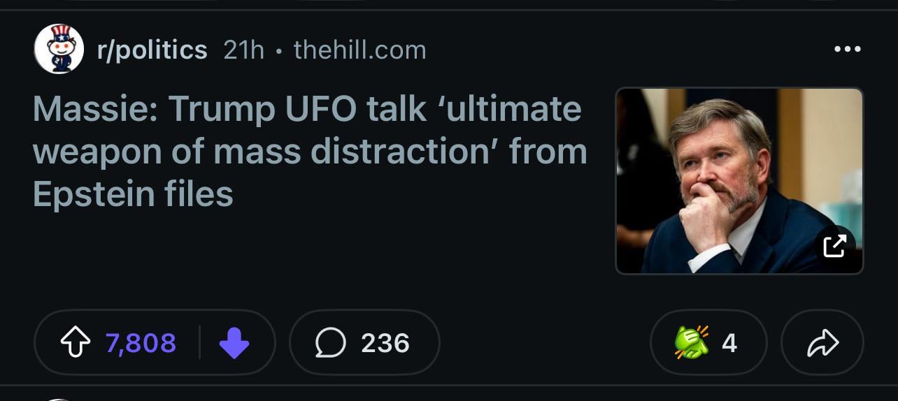 Massie isn’t wrong. It’s classic wag the dog. Don’t look over here–the economy, the tariffs, the Epstein files, my attack that is coming on Iran. *Ooh! Ooh!* Look over here. Look over here. Aliens everybody. Aliens. Who doesn’t love a little aliens?