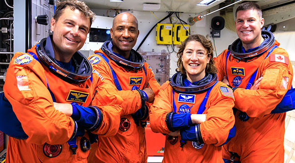 Artemis II NASA astronauts (left to right) Reid Wiseman, Victor Glover, and Christina Koch, and CSA (Canadian Space Agency) astronaut Jeremy Hansen stand in the white room on the crew access arm of the mobile launcher at Launch Pad 39B as part of an integrated ground systems test at Kennedy Space Center in Florida on Wednesday, Sept. 20, 2023. The test ensures the ground systems team is ready to support the crew timeline on launch day.