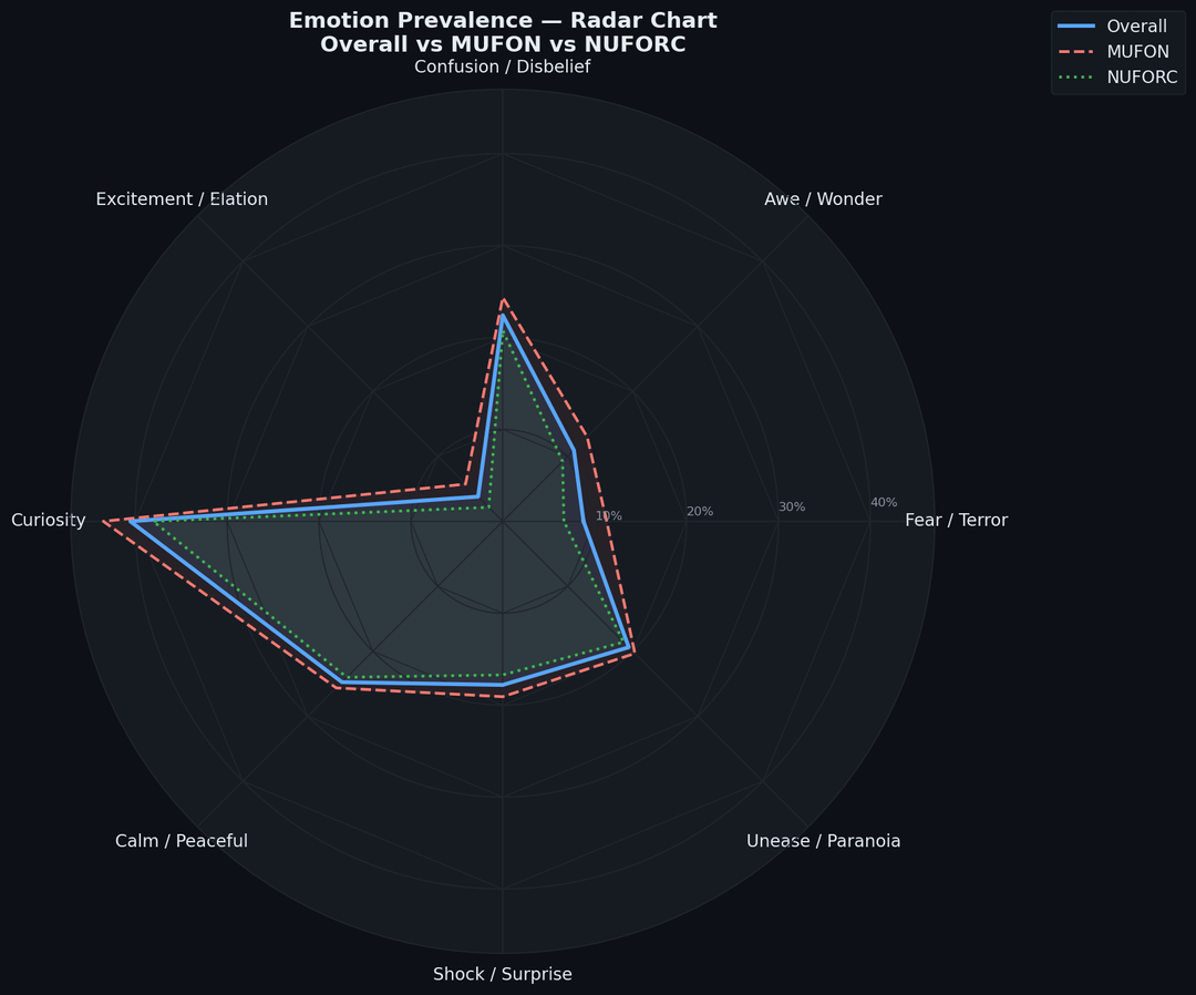 Emotion Radar — Overall vs MUFON vs NUFORC