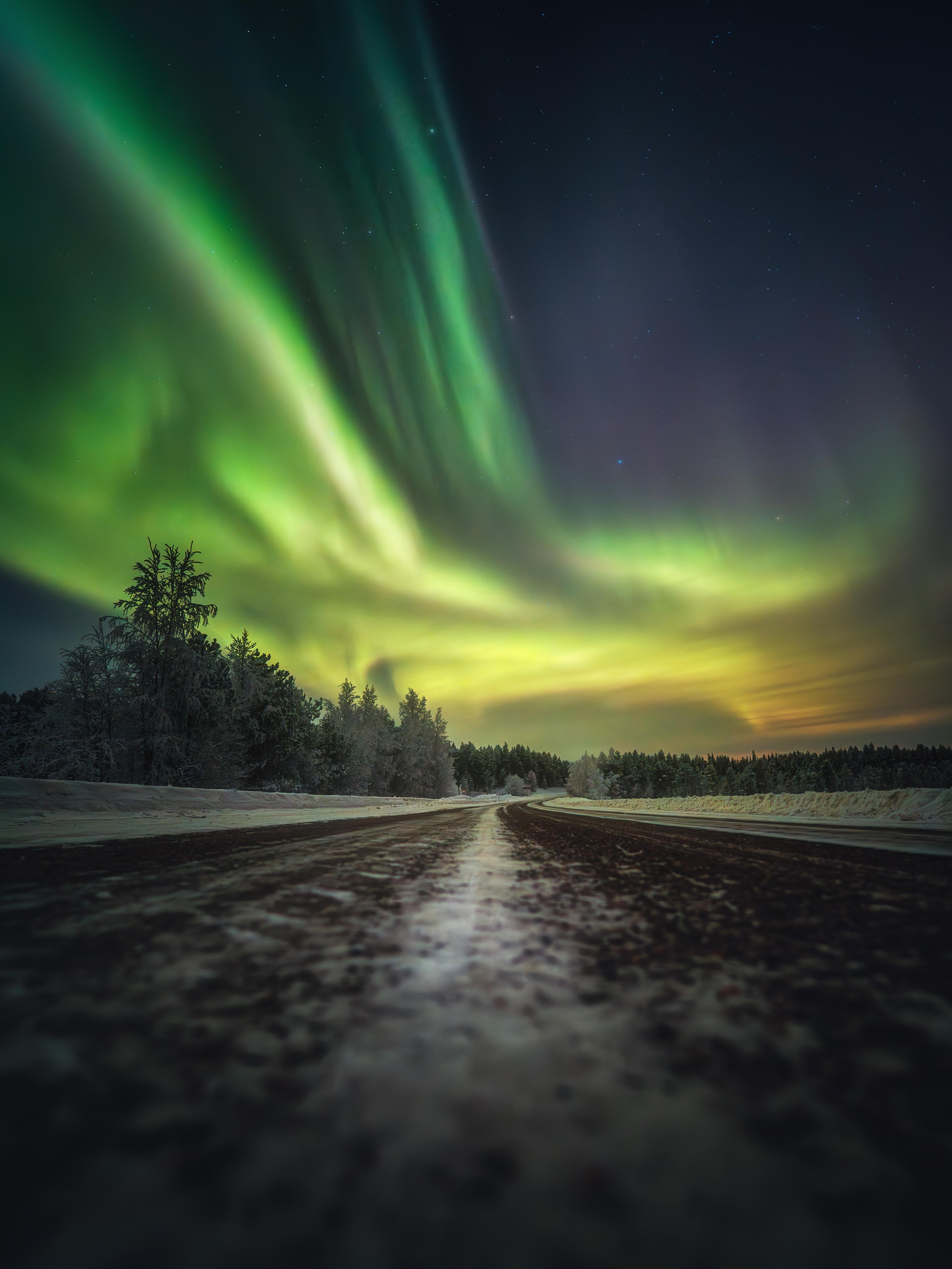 On the first night in Lapland, we were lucky to have a clear sky with the aurora ahead of us. When it was exploding, I was searching for compositions. This is something I like to do, placing the camera close to the ground. The road line while the sky was dancing. A quick shot, and the magic of the magnetosphere.