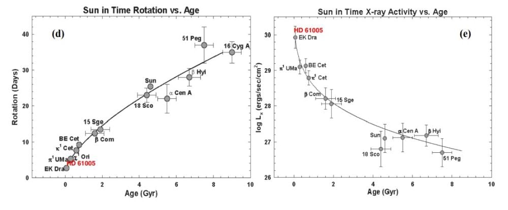 *These figures highlight how main sequence, Sun-like stars change over time. The left panel shows how a star’s rotation rate slows as it ages. The right panel shows how a star’s x-ray output decreases over time. “In general, younger stars with higher angular momentum are rotating much more rapidly and producing hotter coronae and non-thermal XUV radiation via more vigorous magnetic reconnection,” the authors explain. Image Credit: Lisse et al. 2026. ApJ*