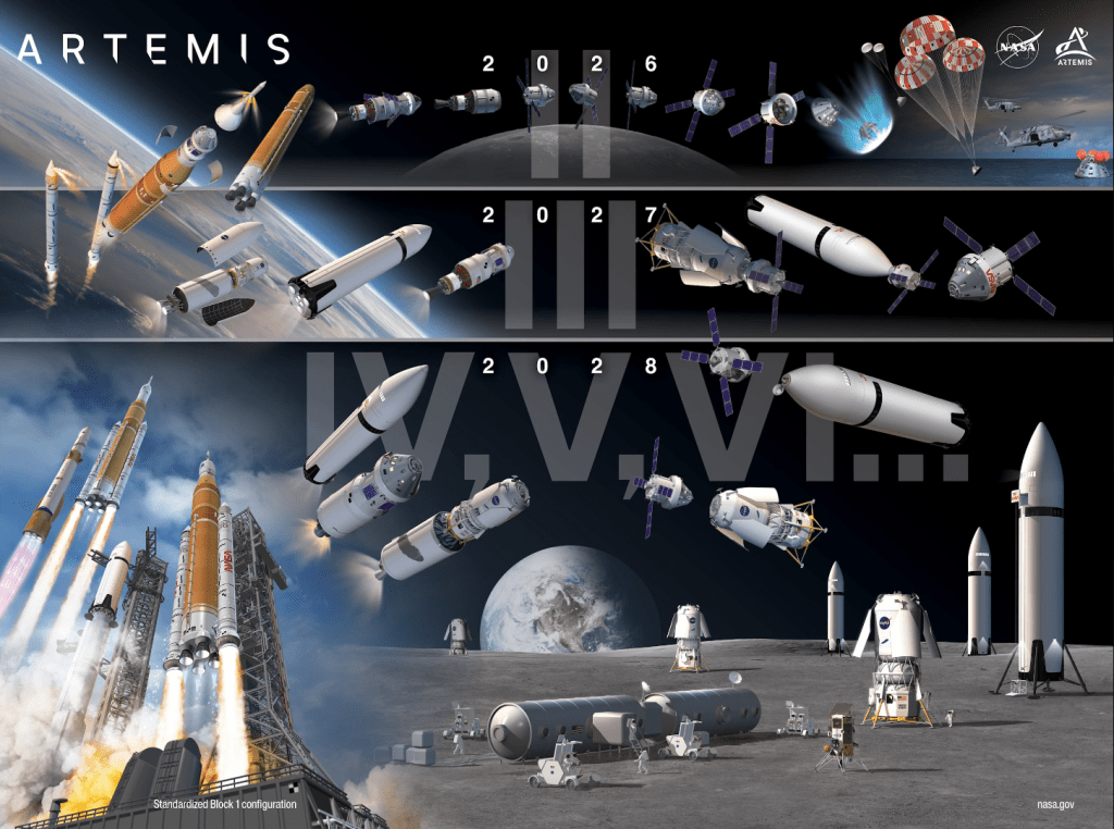 NASA released this graphic of the plans for Artemis: from top to bottom, Artemis II this year, Artemis III in 2027 and Artemis IV in 2028. Credit: NASA