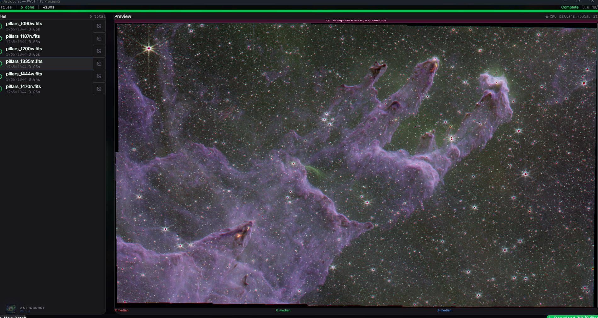 All 6 NIRCam filters (1765×1044 each, downsampled from 7865×4178 originals) loaded and composed in 410ms.