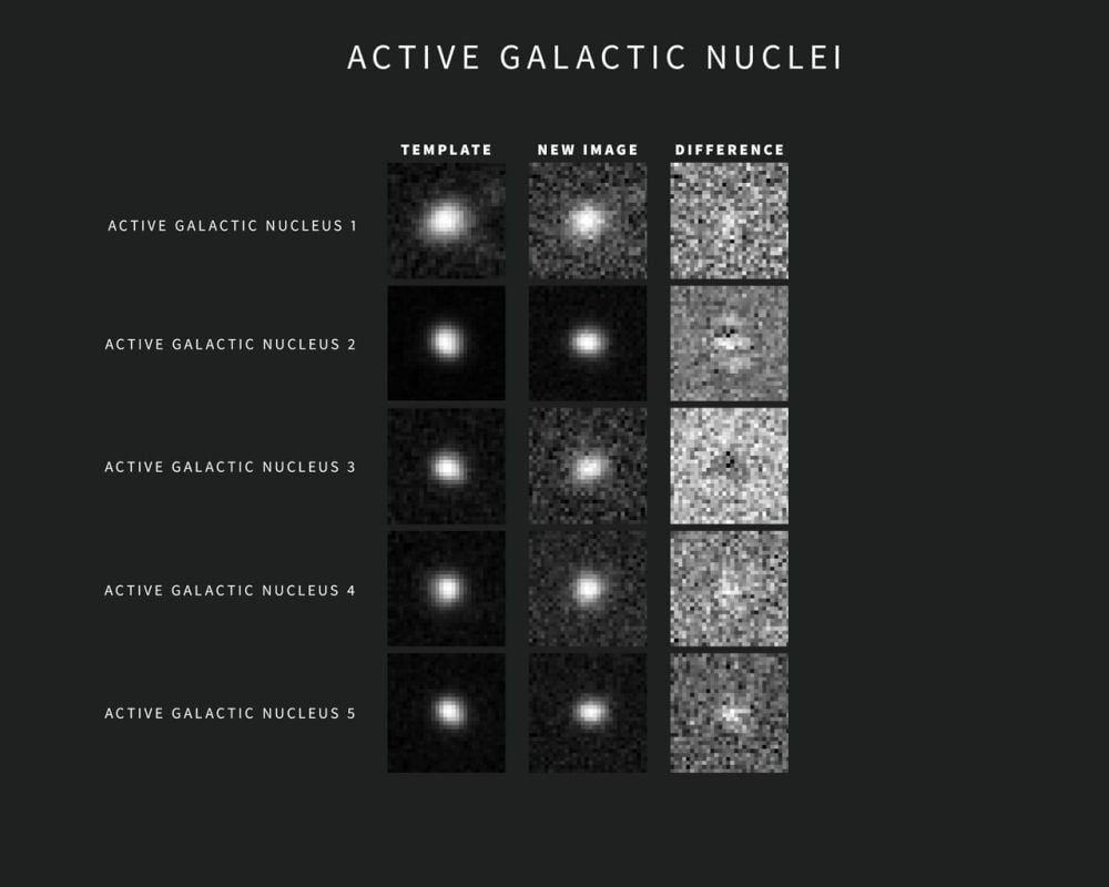 *This image shows five examples of VRO alerts for AGN. The images were captured during commissioning with the LSST Camera. Each alert includes three “postage stamp” images — the left shows the template image, the center shows the new image, and the right shows the subtracted, or difference, image. Image Credit: NSF–DOE Vera C. Rubin Observatory/NOIRLab/SLAC/AURA*