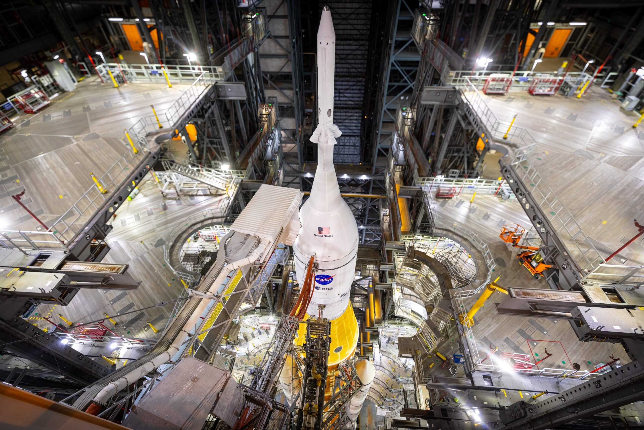 In this view looking down in High Bay 3 inside the Vehicle Assembly Building on Jan. 17, 2026, the work platforms are retracted around NASA’s Artemis II SLS rocket and Orion spacecraft in preparation for rollout to the launchpad. The same rocket architecture will be used in future missions as well. Credit: NASA/Frank Michaux