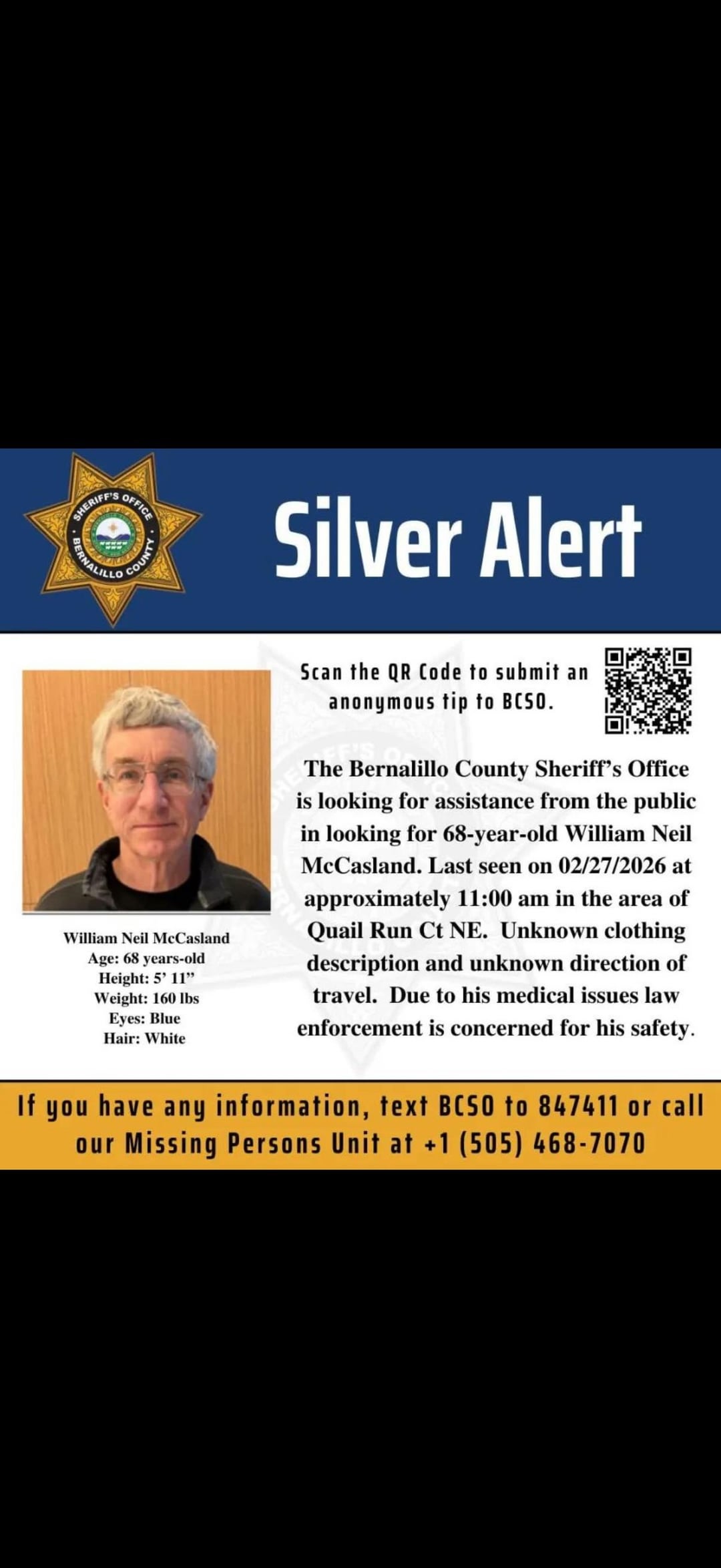 If you have any information, please contact the Bernalillo County Sheriff's Office Missing Persons Unit at 505-468-7070 or text BCSO to 847411. “