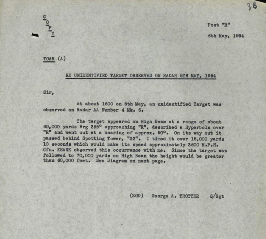Radar operators timed the object travelling 15,000 yards in just 10 seconds, giving it an estimated speed of around 3,600 mph, before it accelerated away and climbed to an altitude greater than 60,000 feet.