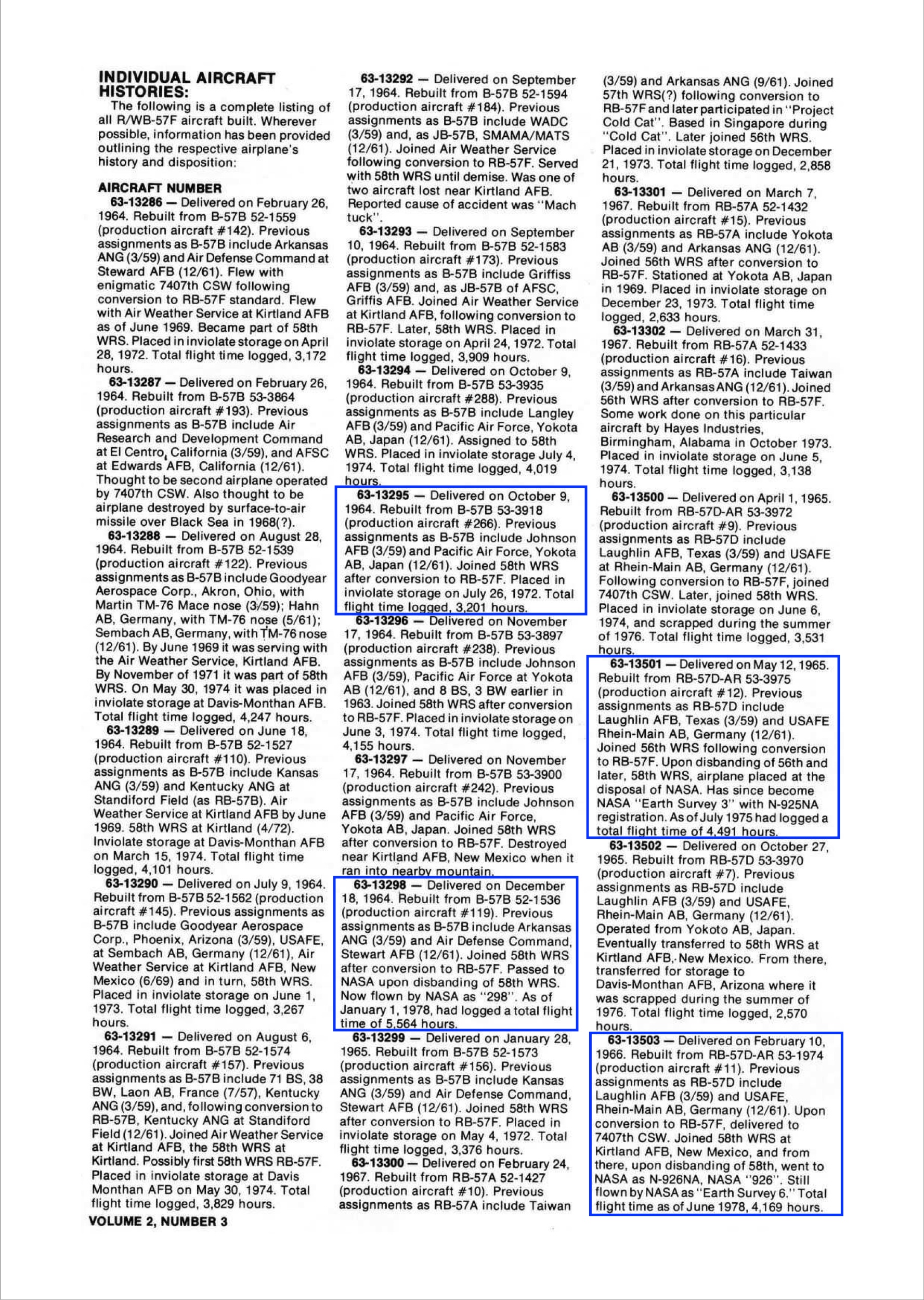 Twenty-one RB-57F aircraft were built and four flew for NASA. This list was compiled by aviation historian Jay Miller in 1980 for the now-defunct Aerophile magazine. (larger version) (credit: Aerophile magazine)