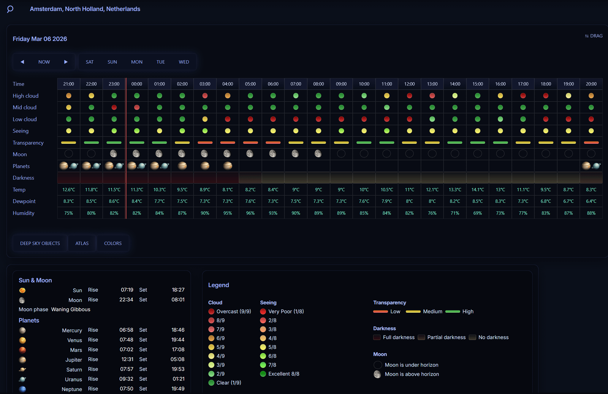 The original goal was to improve how stargazing forecasts are presented. Many tools show a lot of numbers but are hard to interpret quickly, especially when you are outside deciding whether to set up a telescope. StarWatchr focuses on readability and fast comprehension. Cloud cover, seeing, transparency, moon phase, darkness, temperature, dew point and humidity are combined into a visual overview so you can immediately see when conditions are actually good during the night.