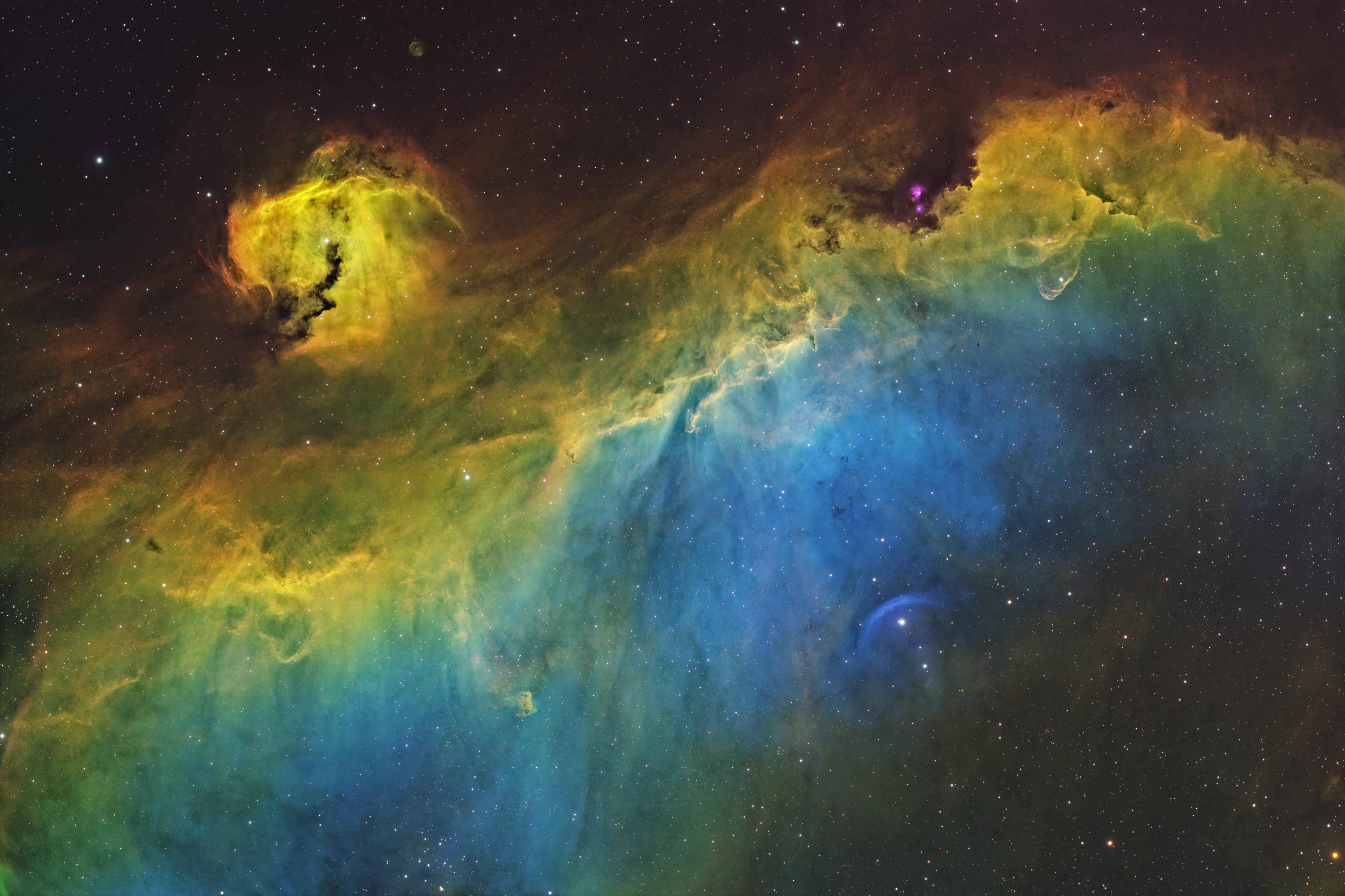 ~19h 30m of 600s exposures of Sii, Oiii, and Ha data using Antlia 3nm pro filters from bortle 1 site (Starfront), ASI2600 MM pro camera, Askar 120 APO telescope with 0.8x reducer. JTW Trident GTR mount. All processing in Pixinsight using Seti Astro and RC astro tools and various curve/histrogram transformations.