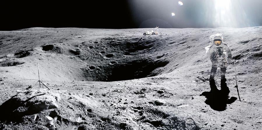 This image captures a moment during the Apollo 16 mission in April 1972 on the lunar surface, featuring astronaut Charles M. Duke Jr. standing near Plum Crater. In the background, the Lunar Roving Vehicle can be seen parked on the lunar highland terrain. (Photo by Mission Commander John W. Young)