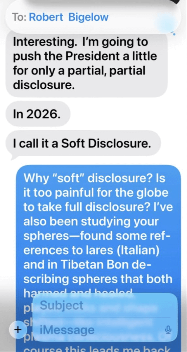 Bigelow Mesage: “Interesting. I’m going to push the President a little for only a partial, partial disclosure. In 2026. I call it a Soft Disclosure.”