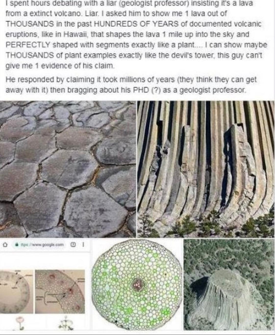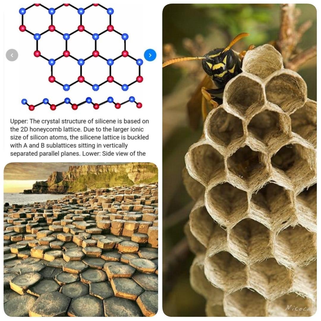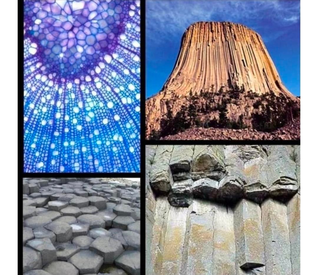 All of the silicon based life petrified into the hexagonal (silicon) structures we still see today. Lava doesnt stop half a mile in the air, cool & become petrified ..But we do have beehives with the same hexagonal shape. in nature we see FRACTALS everywhere. The honeycomb shape is used in the micro as well as the macro.