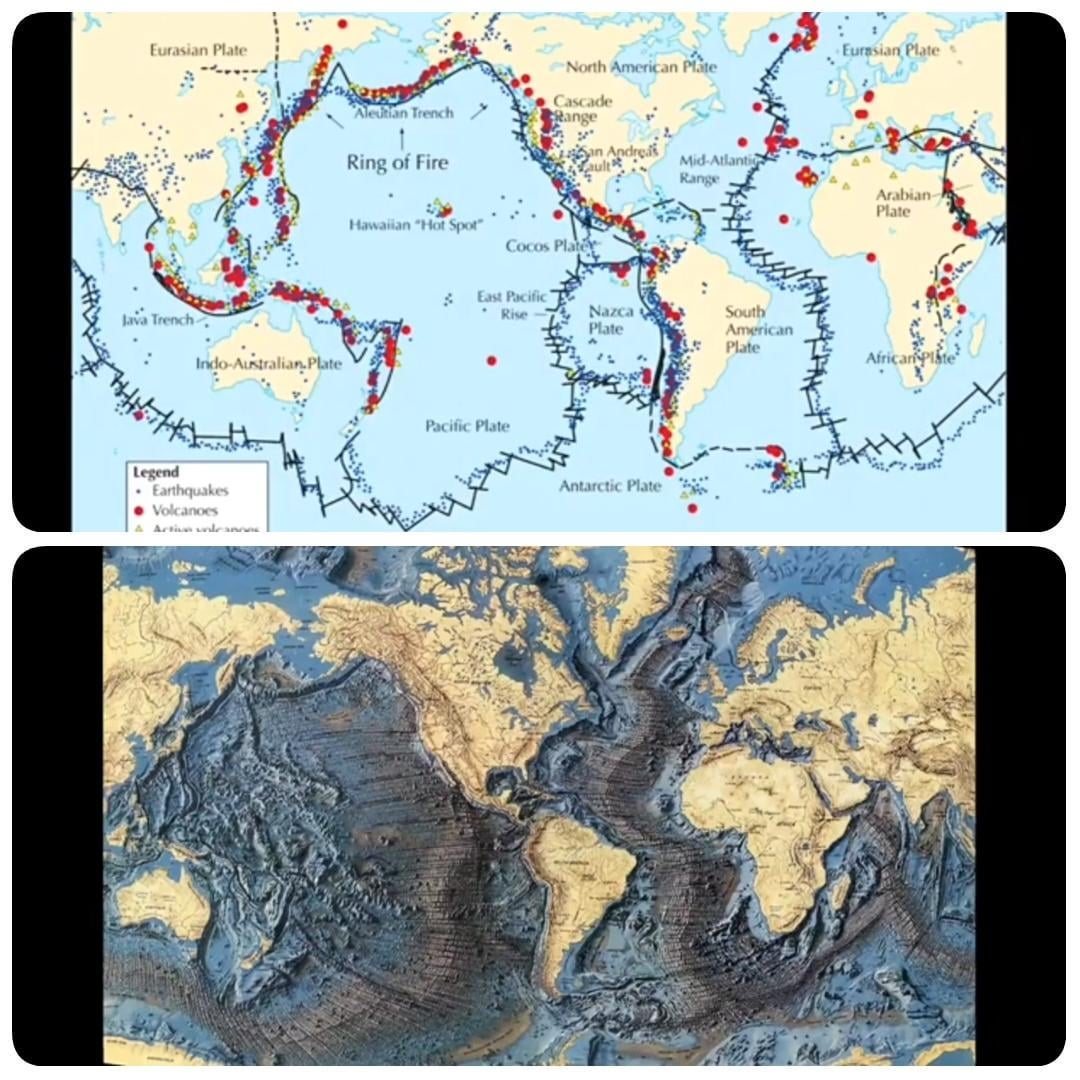 Looking at the image of Earth without its oceans & it looks like huge mining projects happened. Most volcanos are found in the "ring of fire" area, often beside huge trenches. IMO, many of the supposed volcanos are actually massive Waste piles from mining earths silica. Lava flow , volcanic ash are all jus silica & the viscosity, explosive nature of eruptions ALL depend on the silica.