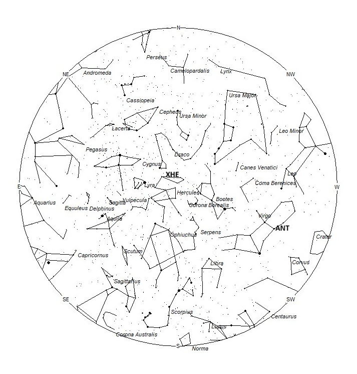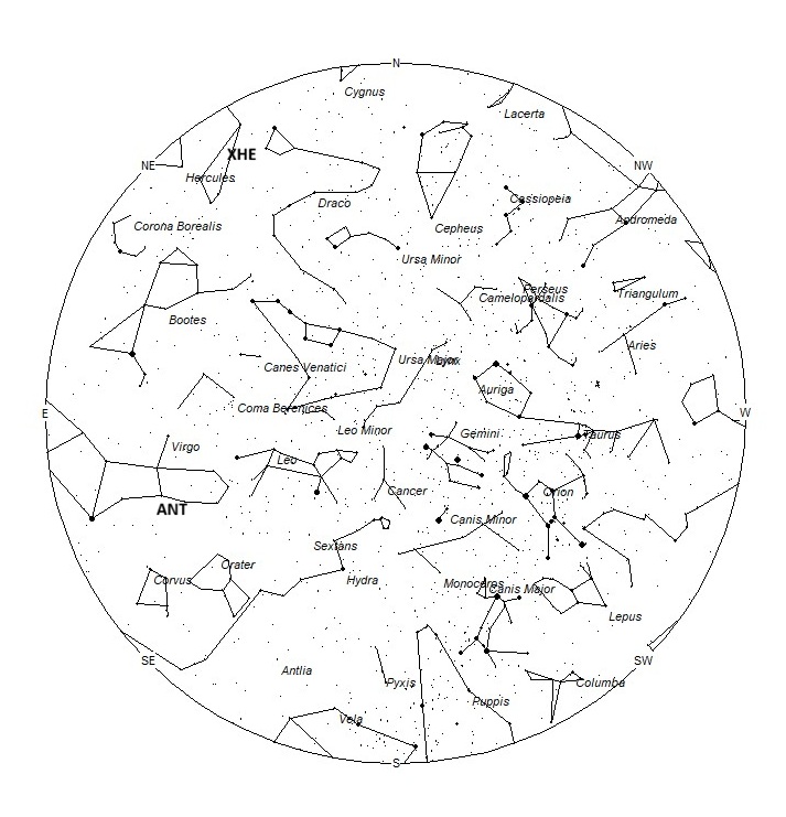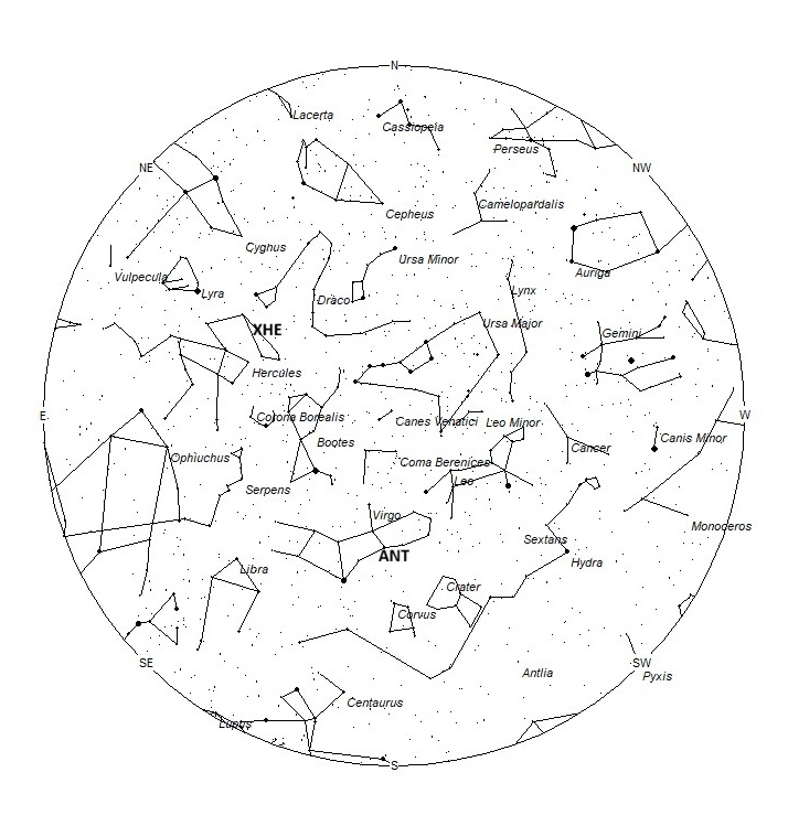 The center of the large Anthelion (ANT) radiant is currently located at 12:28 (187) -03. This position lies in western Virgo, 3 degrees southwest of the 3rd magnitude star known as Porrima (gamma Virginis). This radiant is best placed near 0200 local daylight-saving time (LDST), when it lies on the meridian and is located highest in the southern sky. Rates at this time should be near 2 per hour no matter your location. With an entry velocity of 30 km/sec., the average Anthelion meteor would be of slow velocity.