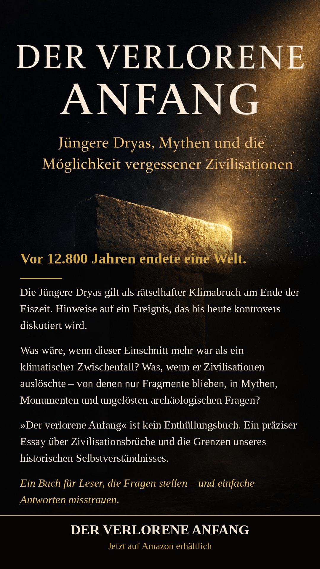 Angefangen hat es mit Erich von Däniken. Nicht weil ich seinen Theorien gefolgt bin — sondern weil er Fragen gestellt hat die mich nicht mehr losgelassen haben. Nur bin ich einen anderen Weg gegangen. Keine Aliens. Keine Esoterik. Stattdessen: Geologie, Archäologie, Astrophysik, Sedimentanalysen. Was ich gefunden habe ist mindestens genauso unglaublich — und es ist belegbar. 12.900 v. Chr. trifft ein kosmischer Hagelschwarm die Erde. Nicht ein Einschlag — Tausende Fragmente gleichzeitig über mehrere Kontinente. Was danach passiert erklärt vieles was uns bis heute rätselhaft erscheint: — Göbekli Tepe entsteht direkt danach — Atlit Yam liegt heute 9 Meter unter Wasser — Puma Punku zeigt technisches Wissen das wir uns nicht erklären können — Der Meeresspiegel steigt um 120 Meter — Ganze Küstenzivilisationen verschwinden Die Beweise liegen buchstäblich auf dem Grund der Ozeane. Ich habe drei Jahre recherchiert und alles in einem Buch zusammengefasst: "Der verlorene Anfang" Taschenbuch und Workbook sind bereits erhältlich. Das Sachbuch erscheint demnächst. Kein Reißerisches. Keine Aliens. Nur die Fragen die die Wissenschaft noch nicht beantwortet hat — und die Belege die es bereits gibt. [Link in Kommentaren]