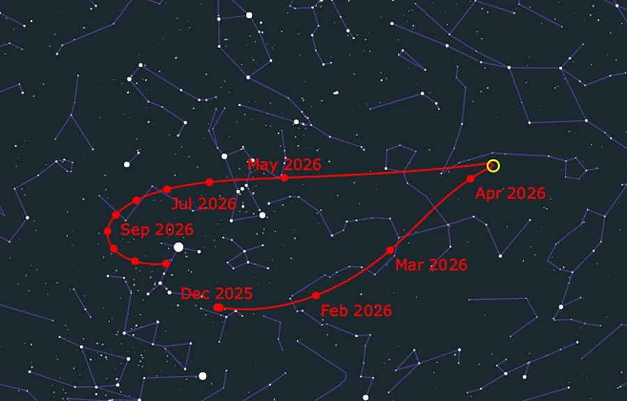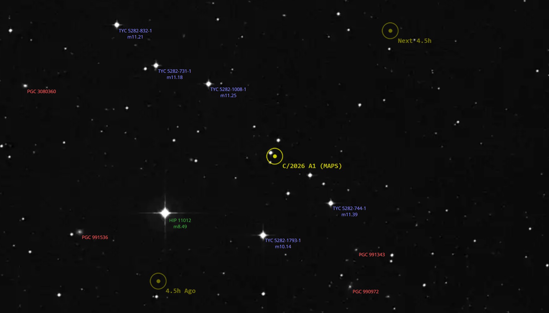 Comet C/2026 A1 is currently moving northwestward in the constellation Eridanus. After it passes the Sun in early April, it will change direction and begin moving rapidly eastward. The yellow circle indicates the Sun’s position at perihelion.