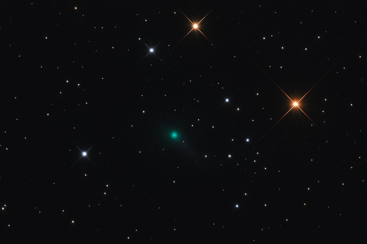 Comet Kreutz C/2026 A1 (MAPS), which glowed a bright turquoise color due to the emission of diatomic carbon, had a magnitude of just 17 when this photo was taken on January 17. The comet will remain relatively faint, except for a few days around its perihelion on April 4, 2026, when it may reach negative magnitudes for a few hours. Photo: Gerald Remann and Michael Jäger