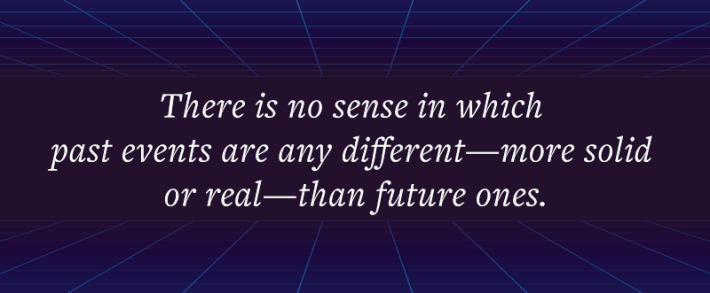 This doesn’t mean that “time” itself doesn’t exist. General relativity does include time as a variable. But it’s simply a mathematical quantity, essentially a label that you can attach to different states of the world, like the time stamp on the DVD. All the things that matter to us humans about time—irreversible transition from past to future; the specialness of Now—are constructed by our minds, true only from our particular perspective. “Contrary to everyday experience, time may not flow at all,” agrees physicist and popular-science author Brian Greene. “Our past may not be gone. Our future may already exist.” The entire history of the universe (and us) just is.