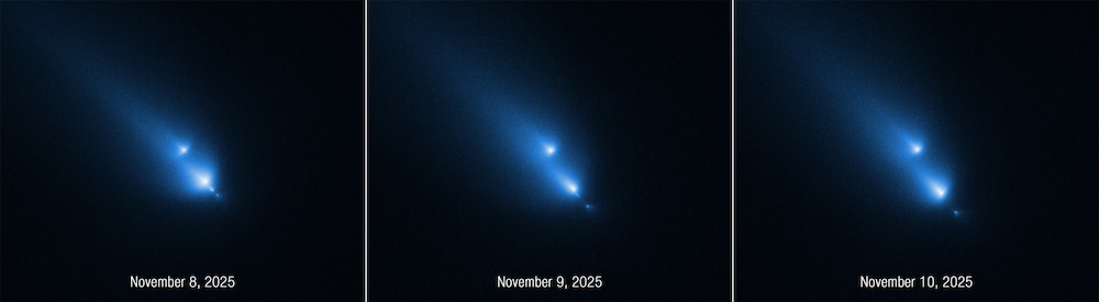 This series of Hubble Space Telescope images of the fragmenting comet C/2025 K1 (ATLAS), or K1 for short, was taken over the course of three consecutive days: November 8, 9, and 10, 2025. Captured by Hubble’s STIS (Space Telescope Imaging Spectrograph) instrument, the sequence shows the progressive disintegration of the comet over this brief period. This is the first time Hubble has witnessed a comet so early in the process of breaking up. Hubble caught K1 fragmenting into at least four pieces, each with a distinct coma, the fuzzy envelope of gas and dust that surrounds a comet’s icy nucleus. Hubble cleanly resolved the fragments, but from the ground they only appeared as barely distinguishable blobs. — STSCI