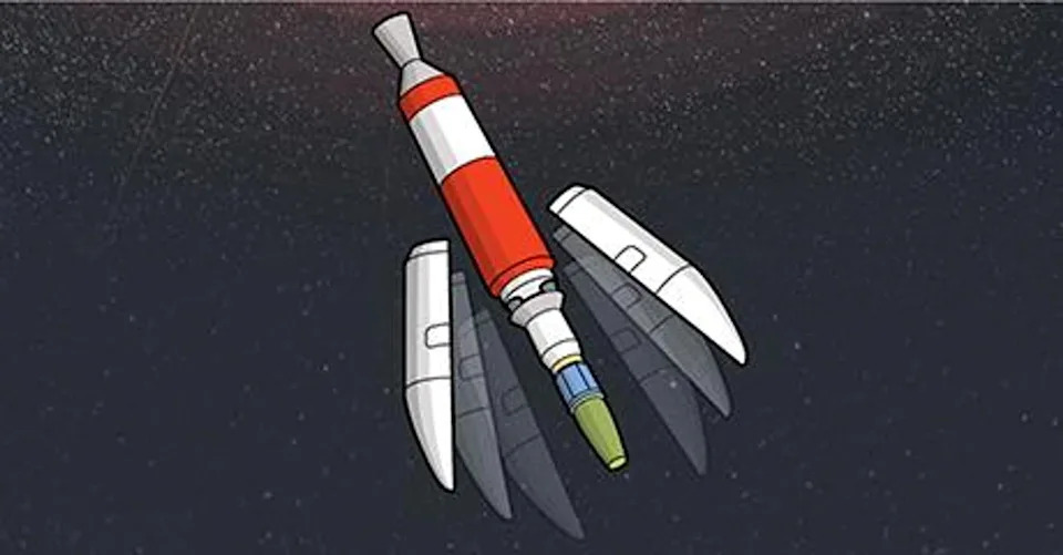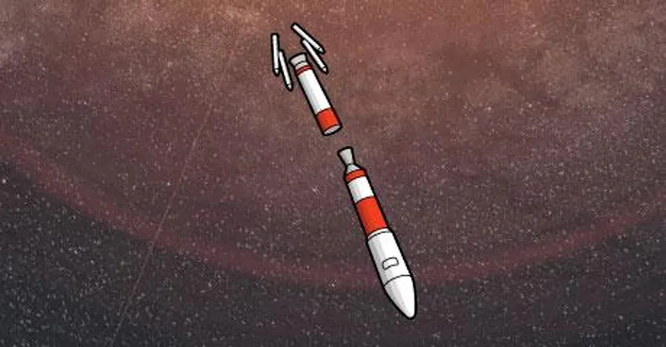 2. After hitting a height of around 50km within two minutes, an empty fuel capsule at the bottom separates from the rocket to shed weight.