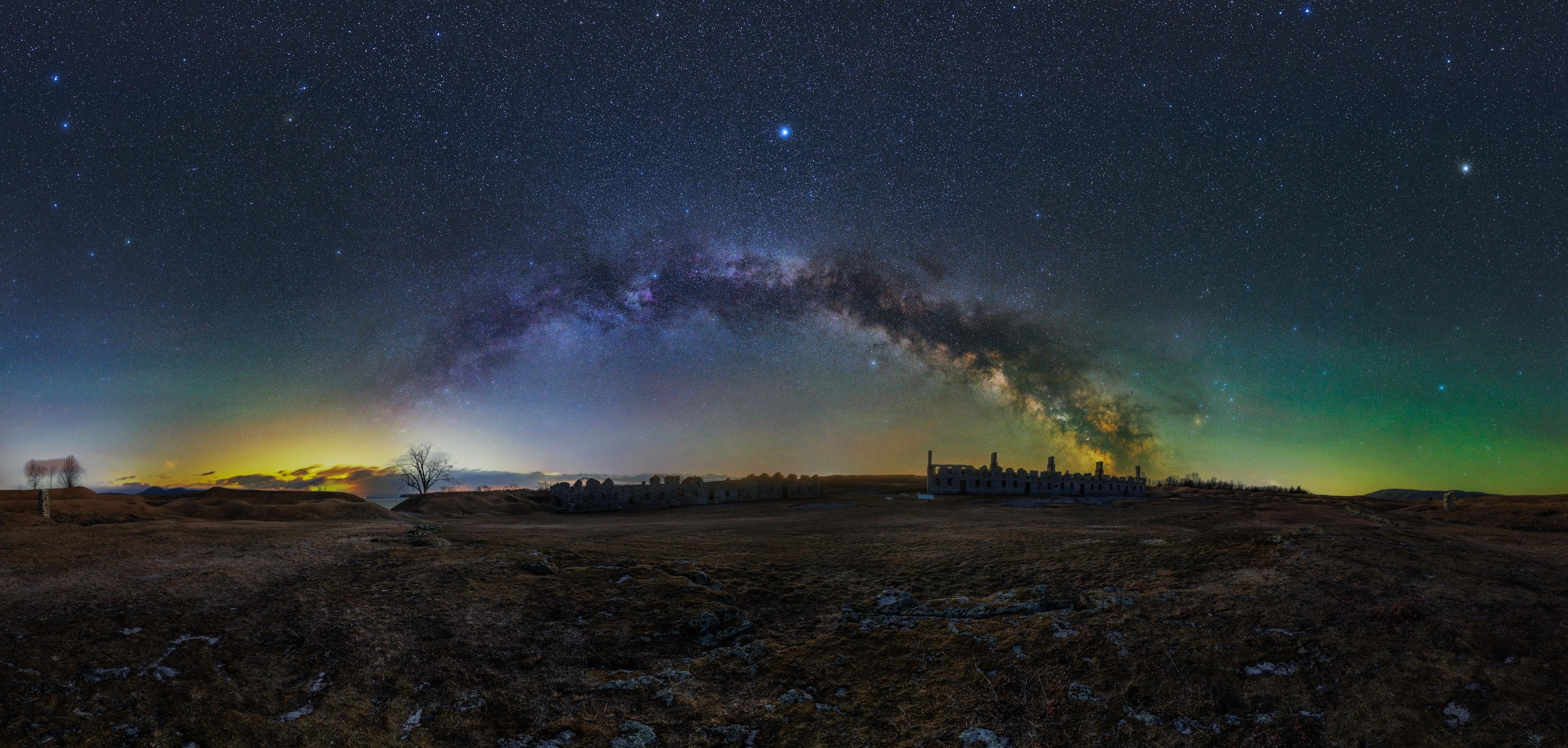 I started this multi-row panorama around 4:40 AM and shot two rows of 12 frames for the sky, and another row of 12 frames for the foreground during blue hour. The resulting image is a massive 237 MP 360° panorama unveiling the historical stronghold and the Milky Way shadowing it above.