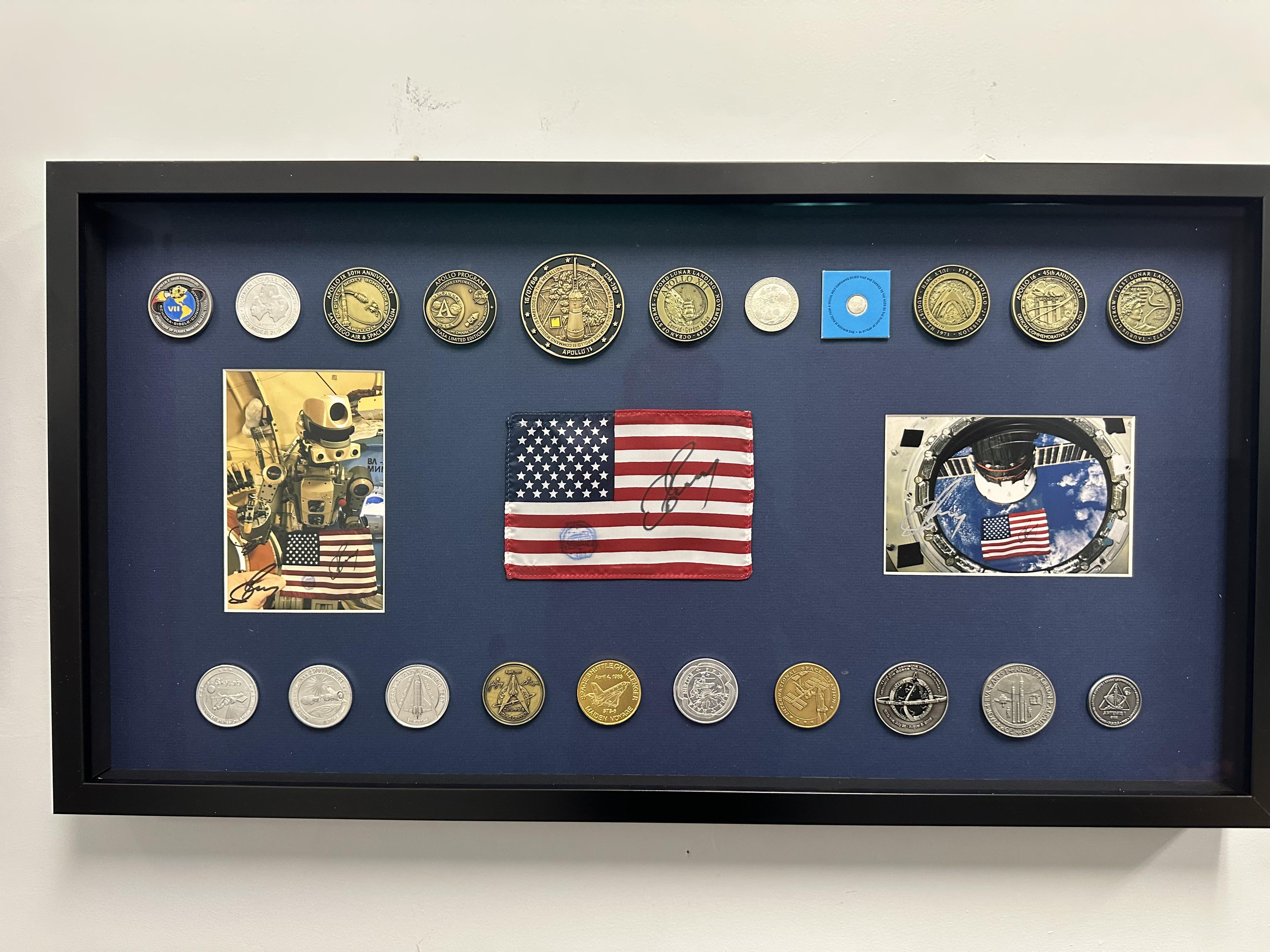 My space collection, featuring medallions containing space-flown (or launchpad) material, and a flag flown on the ISS. I thought you all might enjoy seeing it!
