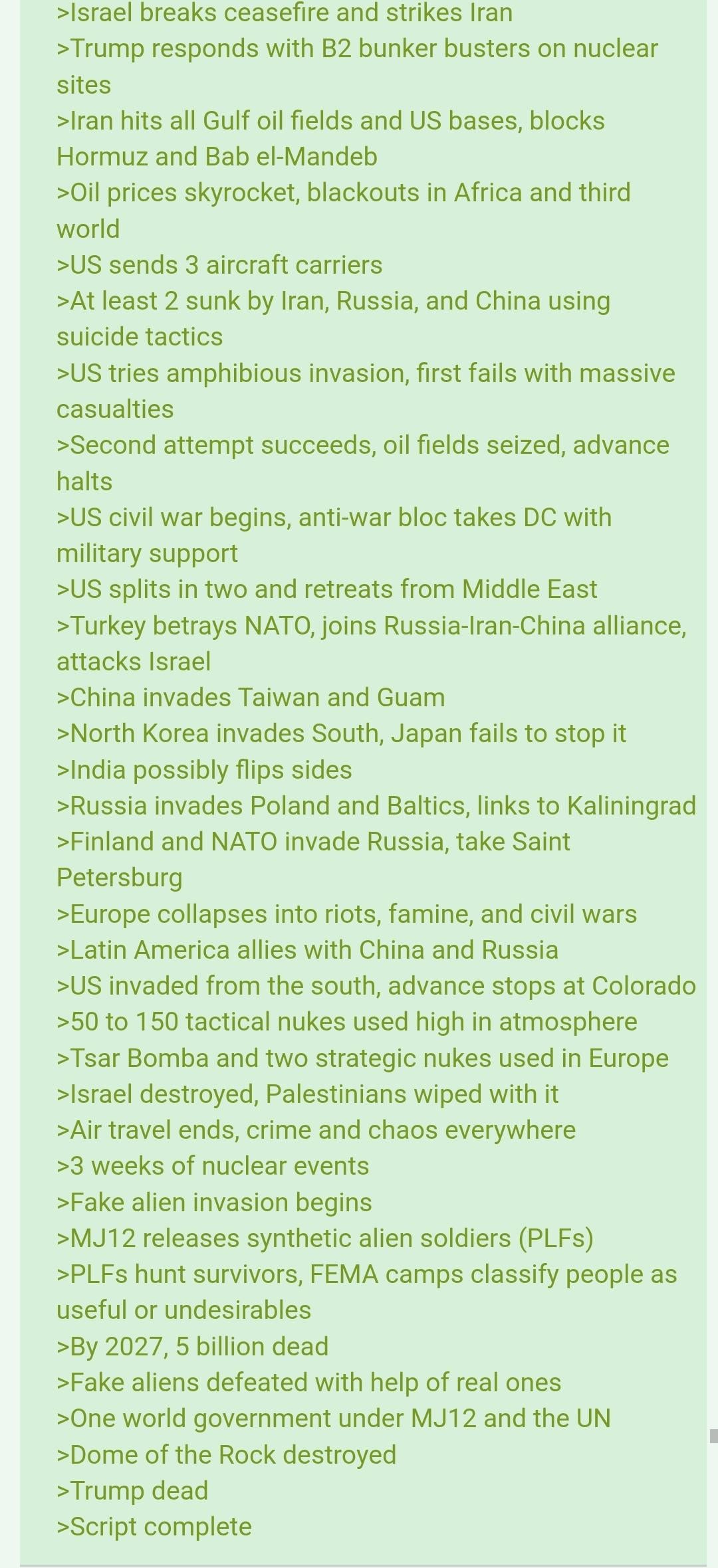 8. Idk whats wrong with this sub, or if its all bots or schizos. But important to mention is, that this post was made on 4Chan some time ago before US started the war. And since the start of the war all predictions on the top, which got cropped, were indeed right and have been playing out in real time. Not saying this gives it any credibility.