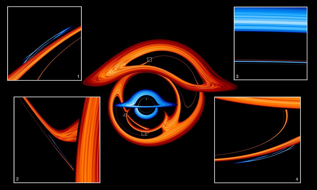 A computer simulation of two black holes orbiting each other, with accretion disks whose images are highly distorted by gravitational lensing. Such objects are often the source of gravity waves (Credit : Jeremy Schnittman, Brian Powell, and Scott Wiessinger/NASA’s Goddard Space Flight Centre)