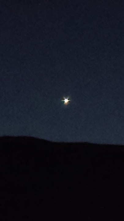 I stepped outside and noticed this light in the sky. I didn't notice red and green marker lights and it appears to move around in a way that doesn't seem like a helicopter. The light disappeared over the mountain range and continued to emit the same light until doing so. This was taken with my phone at 10x zoom braced against my truck for stability.